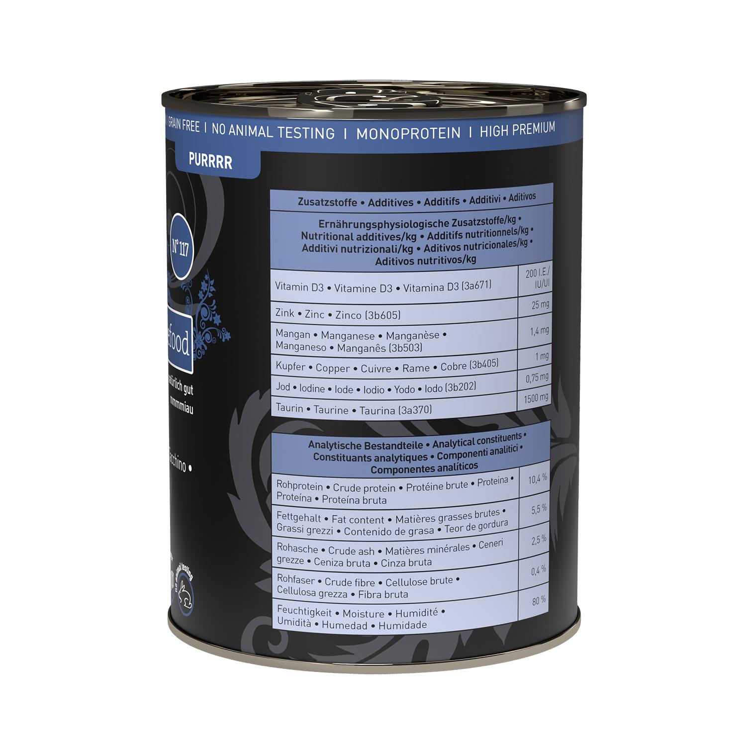 Vorbild für catz finefood ist die Natur. Wir entwickeln unsere Rezepturen nach dem Beutetierkonzept. Weil Katzen Fleischfresser sind, sollen sie auch Fleisch bekommen Deshalb enthält catz finefood Purrrr über 98 frisches Fleisch/Fisch/Innereien und Kochsud, ergänzt mit wertvollen Ölen und wichtigen Mineralstoffen. Wir verzichten bewusst auf die Zugabe von Zucker, Geschmacksverstärkern, Farb- sowie Füllstoffen das haben wir gar nicht nötig. Denn unsere naturbelassenen Zutaten enthalten die besten Nährstoffe deshalb kommen uns Formfleisch oder Fleischmehl nicht in die Dose (oder in den Pouchbeutel) Wichtig ist eben auch, was NICHT drin ist.