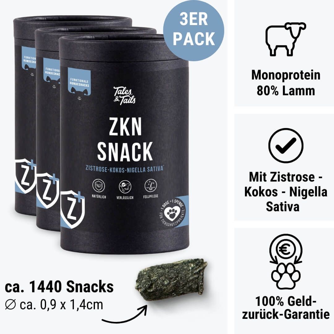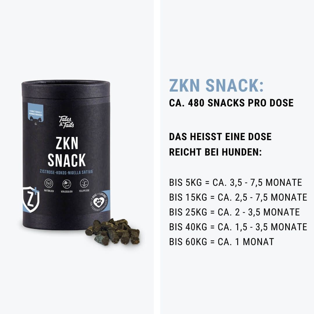 - Hunde bis 5kg: 2-4 Snacks pro Tag
