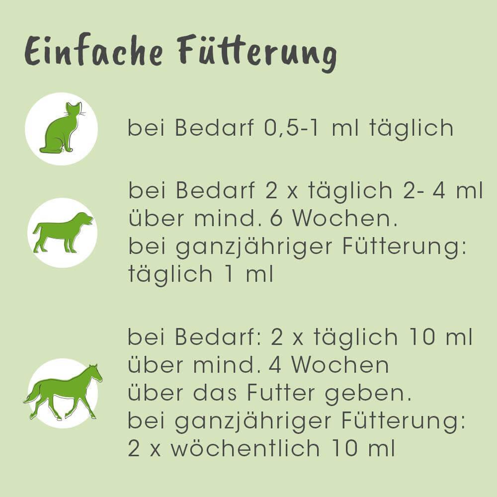 Fütterungsempfehlung: je nach Bedarf ins Futter geben. Katzen: 0,5-1 ml/Tier täglich. Hunde: 2-4 ml/Tier über mind. 6 Wochen 2 x täglich. Bei ganzjährigem Bedarf: 1 ml/Tier täglich. Pferde: 10 ml/Tier über mind. 4 Wochen 2 x täglich. Bei ganzjährigem Bedarf: 10 ml/Tier 2 x wöchentlich. 1 TL entspricht ca. 2 ml.