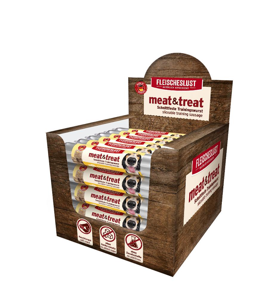 Das neue meat treat Sortiment besticht durch optimierte, nachhaltige Produktrezepturen. Die bewusste Reduktion des Fleischanteils und die wertvolle Ergänzung durch präbiotische Rübenschnitzel sorgen für einen durchschnittlich 24 geringeren CO2-Ausstoß und somit für einen grüneren Pfotenabdruck. Der Feuchtsnack ist gut bekömmlich und kommt ganz ohne künstliche Aromen, Farb- und Konservierungsmittel aus.