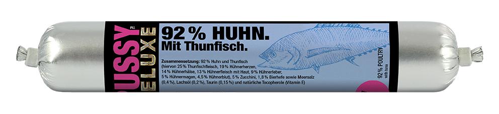 92 Huhn und Thunfisch (hiervon 25 Thunfischfleisch, 19 Hühnerherzen, 13 Hühnerfleisch mit Haut, 14 Hühnerhälse, 9 Hühnerleber, 5 Hühnermagen, 4,5 Hühnerblut), 5 Zucchini, 1,8 Bierhefe sowie Meeressalz (0,4), Lachsöl (0,2), Taurin (0,15) und natürliche Tocopherole (Vitamin E)