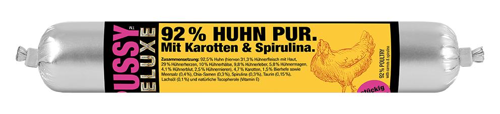 92,5 Huhn (hiervon 31,3 Hühnerfleisch mit Haut, 29 Hühnerherzen, 10 Hühnerhälse, 9,8 Hühnerleber, 5,8 Hühnermagen, 4,1 Hühnerblut, 2,5 Hühnernieren), 4,7 Karotten, 1,5 Bierhefe sowie Meersalz (0,4), Chia-Samen (0,3), Spirulina (0,3), Taurin (0,15), Lachsöl (0,1) und natürliche Tocopherole (Vitamin E)