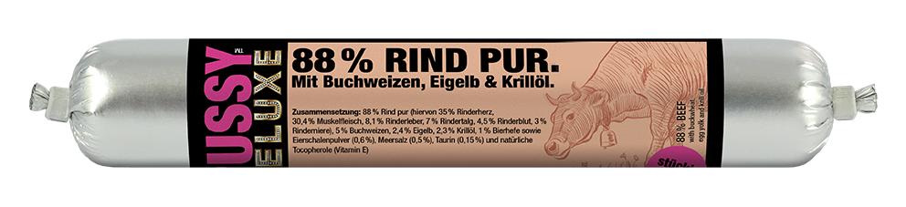 88 Rind pur (hiervon 35 Rinderherz, 30,4 Muskelfleisch, 8,1 Rinderleber, 7 Rindertalg, 4,5 Rinderblut, 3 Rinderniere), 5 Buchweizen, 2,4 Eigelb, 2,3 Krillöl, 1 Bierhefe sowie Eierschalenpulver (0,6), Meeressalz (0,5), Taurin (0,15) und natürliche Tocopherole (Vitamin E)