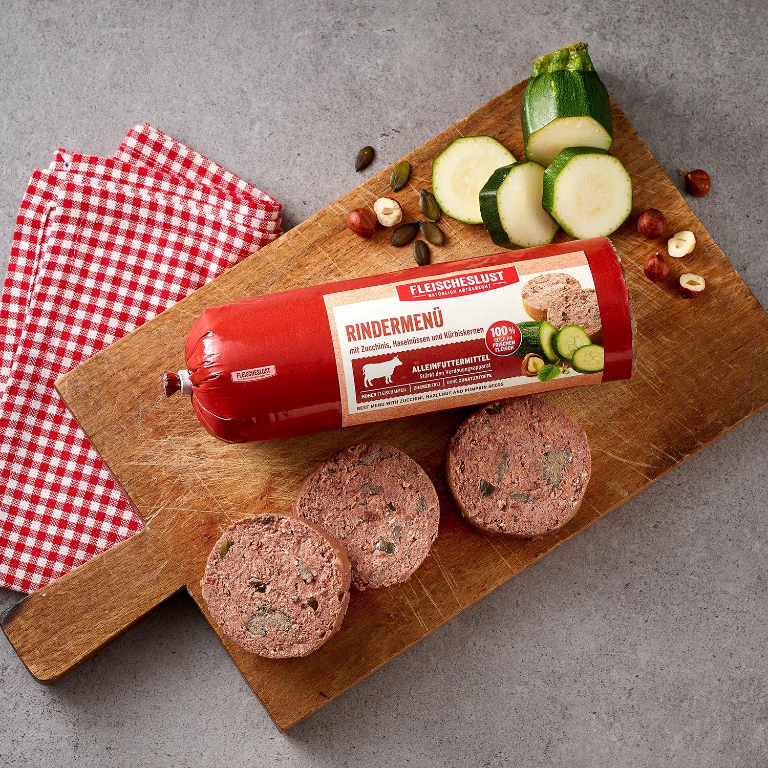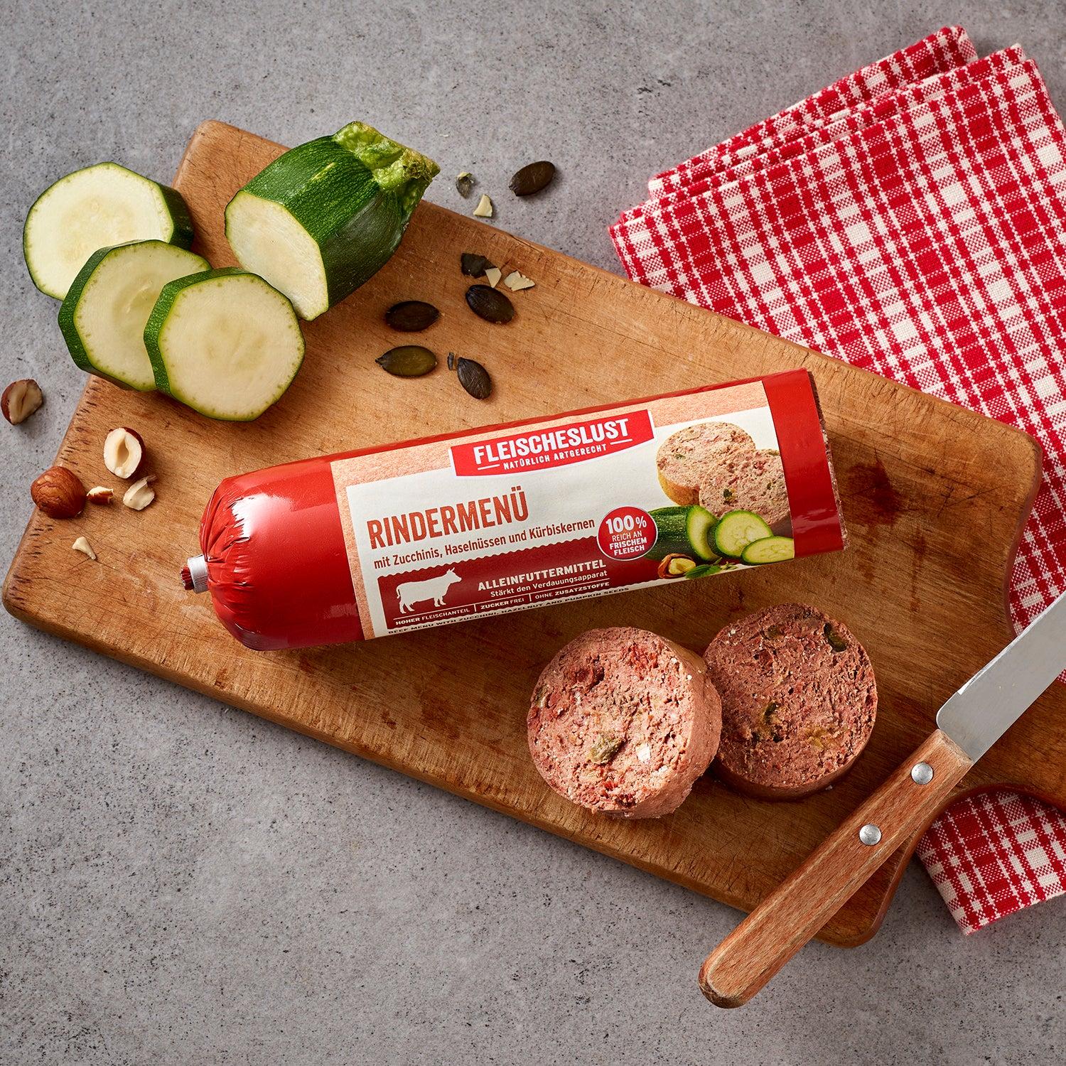 Produktinformationen "Fleischeslust Rindermenü mit Zucchinis, Haselnüssen und Kürbiskernen 200 g"