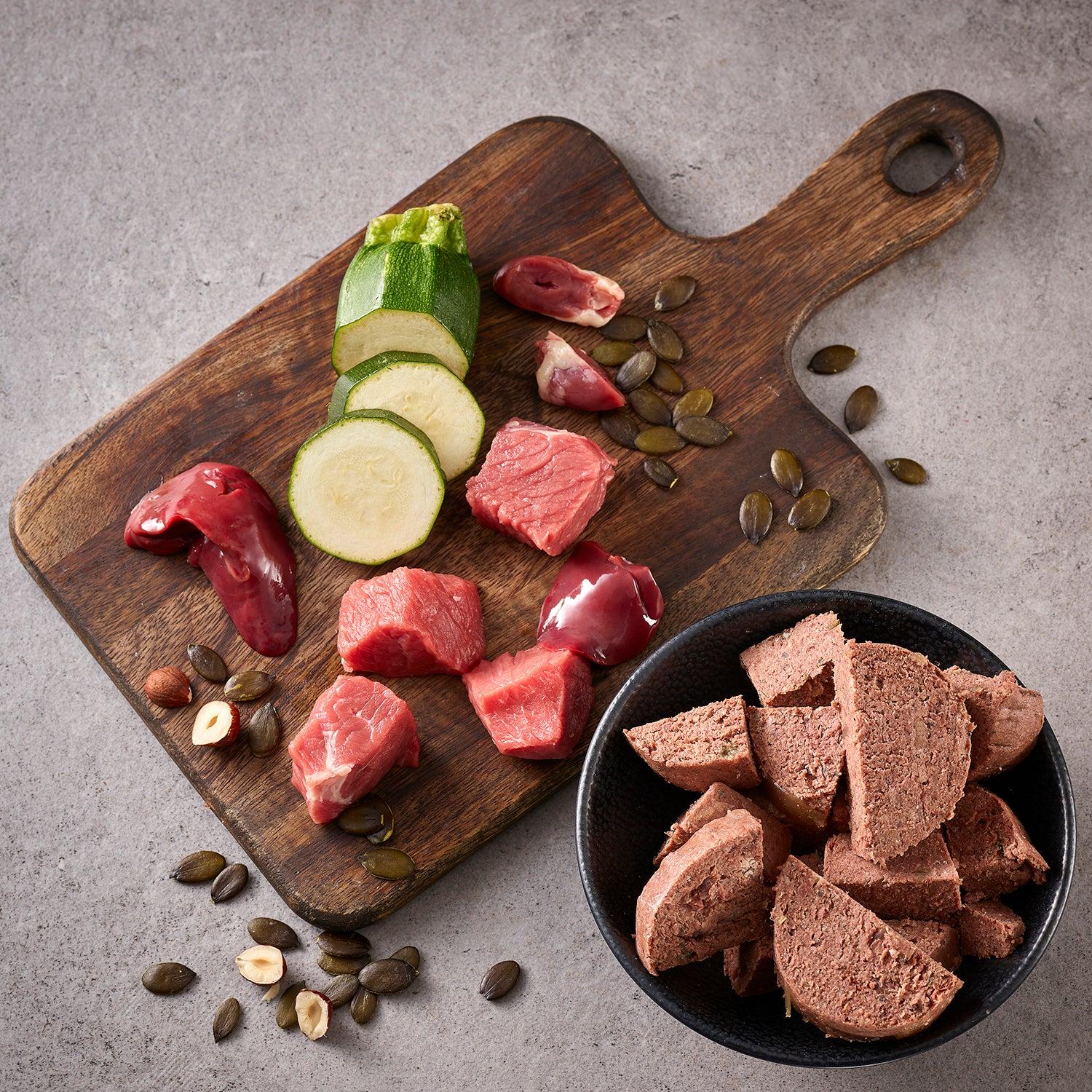 Unser unwiderstehliches Feinschmecker-Rindermenü mit Zucchini, Kürbiskernen und Haselnüssen ist eine unserer erfolgreichsten und beliebtesten Sorten. Für unser Rindermenü verwenden wir ausschließlich Fleisch und Innereien vom Rind, sodass die Würste nur aus einem Protein bestehen.