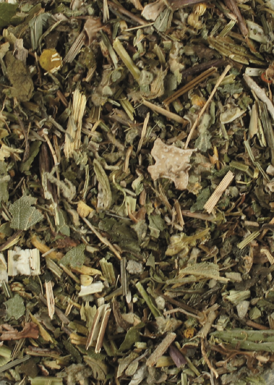 Isländisch Moos, Süßholzwurzel, Eibischwurzel, Anis, Pfefferminze, Andornkraut, Schafgarbenkraut, Fenchel, Brennnessel, Spitzwegerichkraut, Thymian, Schlüsselblumen, Echinacea, Kamillenblüten, Birkenblätter, Mariendistelsamen, Lindenblüten, Salbeiblätter, Tausendgüldenkraut, Ackerschachtelhalm, Löwenzahnwurzel mit Kraut, Klebkraut, Klettenwurzel, Goldrute, Kurkuma, Zimt