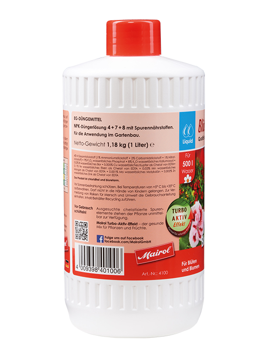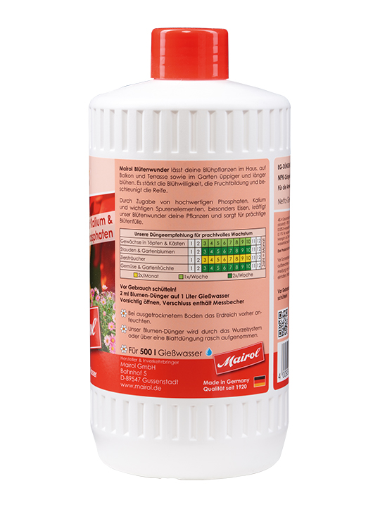 NPK-Dünger 4 + 7 + 8Bestseller unserer Stammkunden besonders zu empfehlen in der Blütezeit Die Oma von 1920 nahm schon Mairol Pflanzen mögen Mairol.Mairol Blütenwunder vitalisiert Blühpflanzen im Haus, auf Balkon und Terrasse sowie im Garten. Es stärkt die Blühwilligkeit, die Fruchtbildung und beschleunigt die Reife. Mit der speziellen Nährstoffzusammensetzung entwickeln die Pflanzen üppige und langanhaltende farbenfrohe Blüten.Mairol Blütenwunder ist ein Spezialdünger, der die Pflanzen kräftigt und für gesundes Wachstum sorgt.Besonders geeignet für: Begonien, Petunien, Chrysanthemen, Geranien, Engelstrompeten2 ml Blumen-Dünger auf 1 Liter Gießwasser