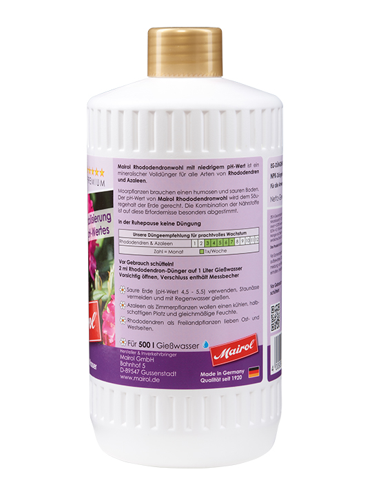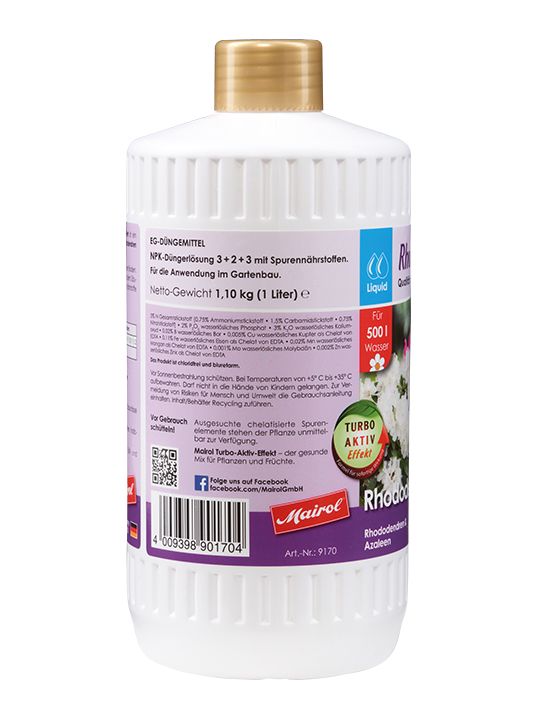 Anwendung:2 ml Rhododendron-Dünger auf 1 Liter Gießwasser20 ml Rhododendron-Dünger auf 10 Liter GießwasserPflanzen erst ca. vier Wochen nach dem Pflanzen oder Umtopfen düngen.1 l reicht für 500 l GießwasserVor Gebrauch schütteln.Unser Expertentipp: Wir empfehlen stets bei Rhododendren darauf zu achten, dass diese innerhalb der Ruhephase genügend Wasser zur Verfügung haben. Das gilt für die Zeit zwischen Frost und normalen Temperaturen. Rezeptur:3 N Gesamtstickstoff 0,75 Ammoniumstickstoff • 1,5 Carbamidstickstoff • 0,75 Nitratstickstoff • 2 P2O5 wasserlösliches Phosphat • 3 K2O wasserlösliches Kalium-oxyd • 0,02 B wasserlösliches Bor • 0,005 Cu wasserlösliches Kupfer als Chelat von EDTA • 0,11 Fe wasserlösliches Eisen als Chelat von EDTA • 0,02 Mn wasserlösliches Mangan als Chelat von EDTA • 0,001 Mo wasserlösliches Molybdän • 0,002 Zn wasserlösliches Zink als Chelat von EDTA Inhaltsstoffe von A bis Z:Stickstoff N:Als Energielieferant jeder Pflanze maßgebend für das Pflanzenwachstum.Phosphor P2O5:Für üppige Blüten- und Farbenpracht, zur Festigung des Gewebes sowie zur Förderung von Wurzelwachstum und Keimung.Kalium K2O:Für die gesamte Festigkeit und somit auch die Kräftigkeit der Pflanze verantwortlich reguliert den Wasserhaushalt und schützt die Zellen vor Kälte.Mairol Rhododendronwohl versorgt die Pflanzen mit Stickstoff, Phosphat, Kaliumoxyd und wichtigen Spurenelementen wie Magnesium, Bor, Kupfer, Eisen, Mangan, Molybdän und Zink. Der Mix unserer Nährstoffkomponenten ermöglicht der Pflanze diese unmittelbar aufzunehmen.Notwendige Pflanzennährstoffe, die nur in sehr geringen Mengen von den Pflanzen benötigt werden, sind teilweise sehr wichtig für die Pflanzen.- Magnesiumoxyd MgO als wichtiger Bestandteil des Chlorophylls unentbehrlich für die Blattgrünbildung.