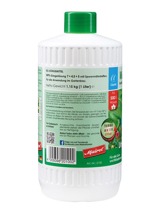 Anwendung:Messbecher in der Verschlusskappe2 ml Universal-Dünger auf 1 Liter Gießwasser20 ml Universal-Dünger auf 10 Liter GießwasserPflanzen erst ca. vier Wochen nach dem Pflanzen oder Umtopfen düngen.1 l reicht für 500 l GießwasserVor Gebrauch schütteln.Unser Expertentipp: Mairol Wachstumselixier in der Wachstumsphase der Pflanze und danach Wechsel auf Mairol Blütenwunder in der Blühphase.Die Mairol-Vielfalt: Vom Universaldünger bis zum Spezialdünger.Mairol So wichtig wie Wasser Rezeptur:7 N Gesamtstickstoff 1,8 Ammoniumstickstoff • 3,5 Carbamidstickstoff • 1,8 Nitratstickstoff • 4,5 P2O5 wasserlösliches Phosphat • 5 K2O wasserlösliches Kaliumoxyd • 0,02 B wasserlösliches Bor • 0,005 Cu wasserlösliches Kupfer als Chelat von EDTA • 0,11 Fe wasserlösliches Eisen als Chelat von EDTA • 0,02 Mn wasserlösliches Mangan als Chelat von EDTA • 0,001 Mo wasserlösliches Molybdän • 0,002 Zn wasserlösliches Zink als Chelat von EDTA Inhaltsstoffe von A bis Z:Stickstoff N:Als Energielieferant jeder Pflanze maßgebend für das Pflanzenwachstum.Phosphor P2O5:Für üppige Blüten- und Farbenpracht, zur Festigung des Gewebes sowie zur Förderung von Wurzelwachstum und Keimung.Kalium K2O:Für die gesamte Festigkeit und somit auch die Kräftigkeit der Pflanze verantwortlich reguliert den Wasserhaushalt und schützt die Zellen vor Kälte.Mairol Wachstumselixier versorgt die Pflanzen optimal mit Stickstoff, Phosphat, Kaliumoxyd und wichtigen Spurenelementen wie Magnesium, Bor, Kupfer, Eisen, Mangan, Molybdän und Zink. Der Mix unserer Nährstoffkomponenten ermöglicht der Pflanze diese unmittelbar aufzunehmen.Notwendige Pflanzennährstoffe, die nur in sehr geringen Mengen von den Pflanzen benötigt werden, sind teilweise sehr wichtig für die Pflanzen.- Magnesiumoxyd MgO als wichtiger Bestandteil des Chlorophylls unentbehrlich für die Blattgrünbildung.