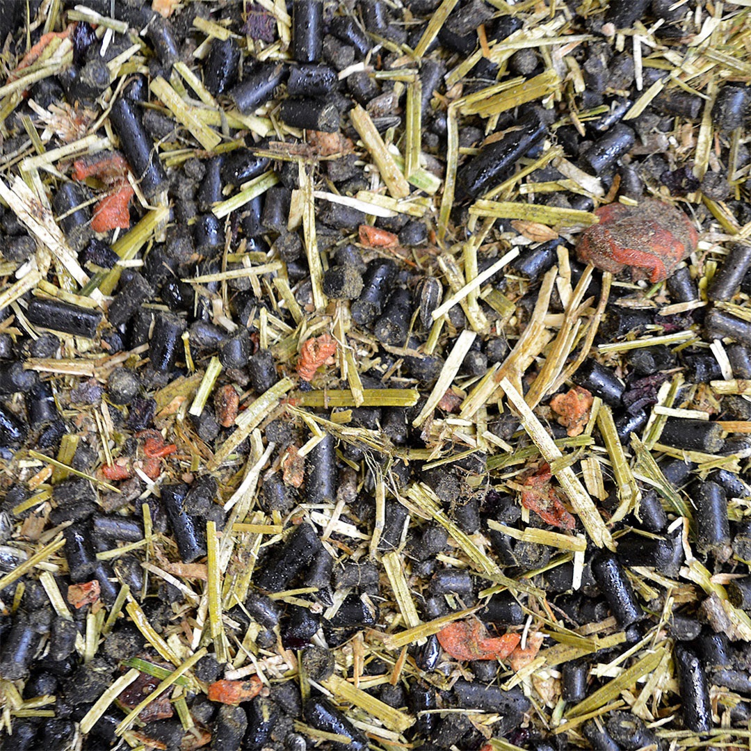 Luzerne gehackt / Reiskleie / Lignocellulose / Schwarze Sonnenblumenkerne // Mariendistelöl / Johannisbrotstücke / Topinambur (fermentiert) / Zuckerrohrsirup / Calciumcarbonat / Karotte / Natriumchlorid (salz) / Kräutermischung