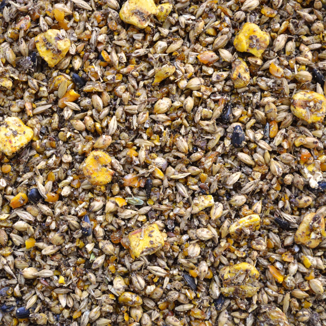 Gerste (getoastet, gerollt) / Gepuffter Mais NGMO // Topinambur (fermentiert) / Schwarze Sonnenblumenkerne / Rohrmelasse / Leinsamen / Calciumcarbonat / Feuchte Getreideschlempe / Bierhefe / Natriumchlorid (salz)