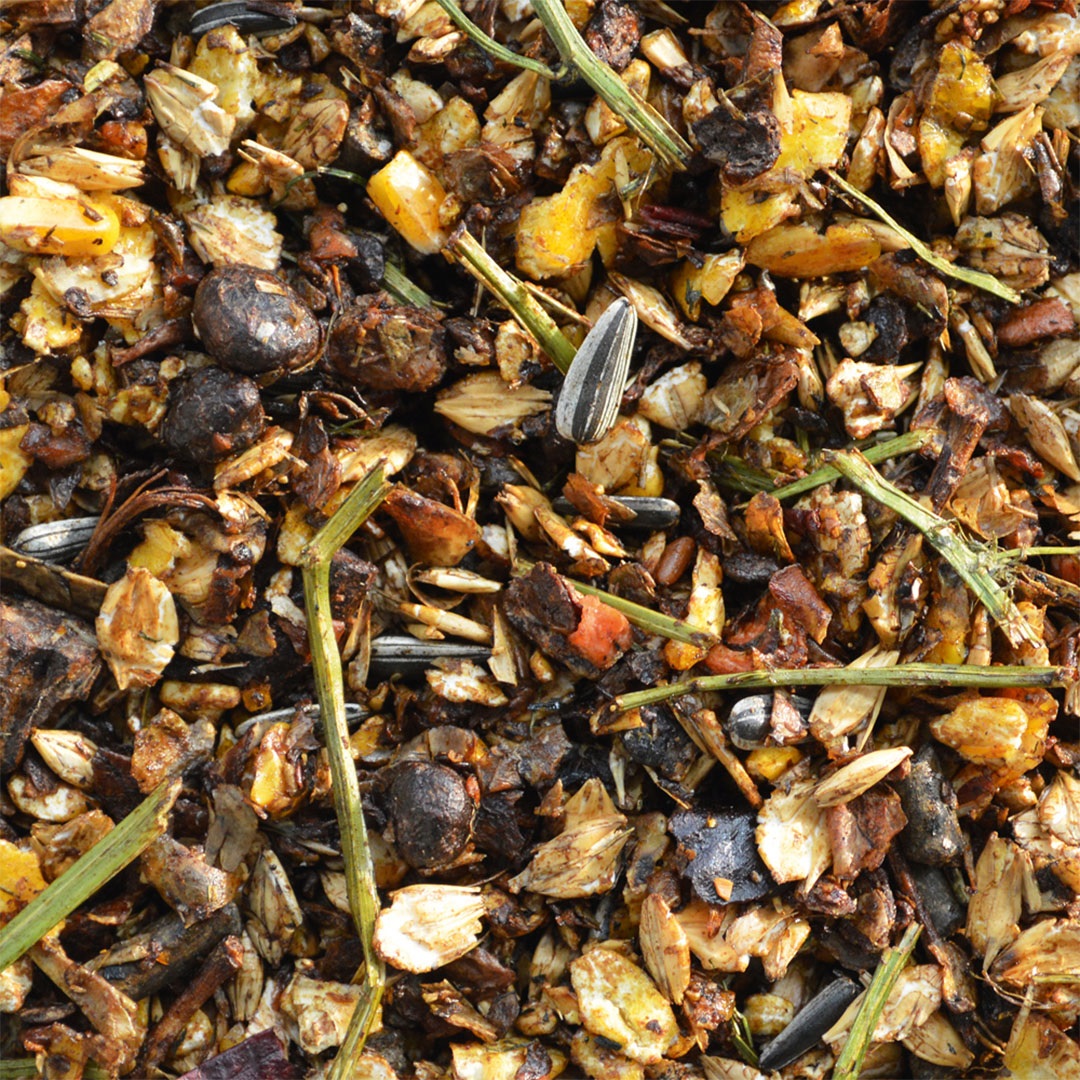 Calciumcarbonat / Natriumchlorid (salz) / Gerstenflocken / Maisflocken NGMO / Luzerne gehackt / Zuckerrohrmelasse / Sojaöl NGMO / Weizenkleie / Rübenschnitzelflocken (<8% zucker) / Weizen / Schwarze Sonnenblumenkerne / Karottenflocken / Kräutermischung / Magnesiumoxid / Monocalciumphosphat / Bierhefe / Pfefferminze