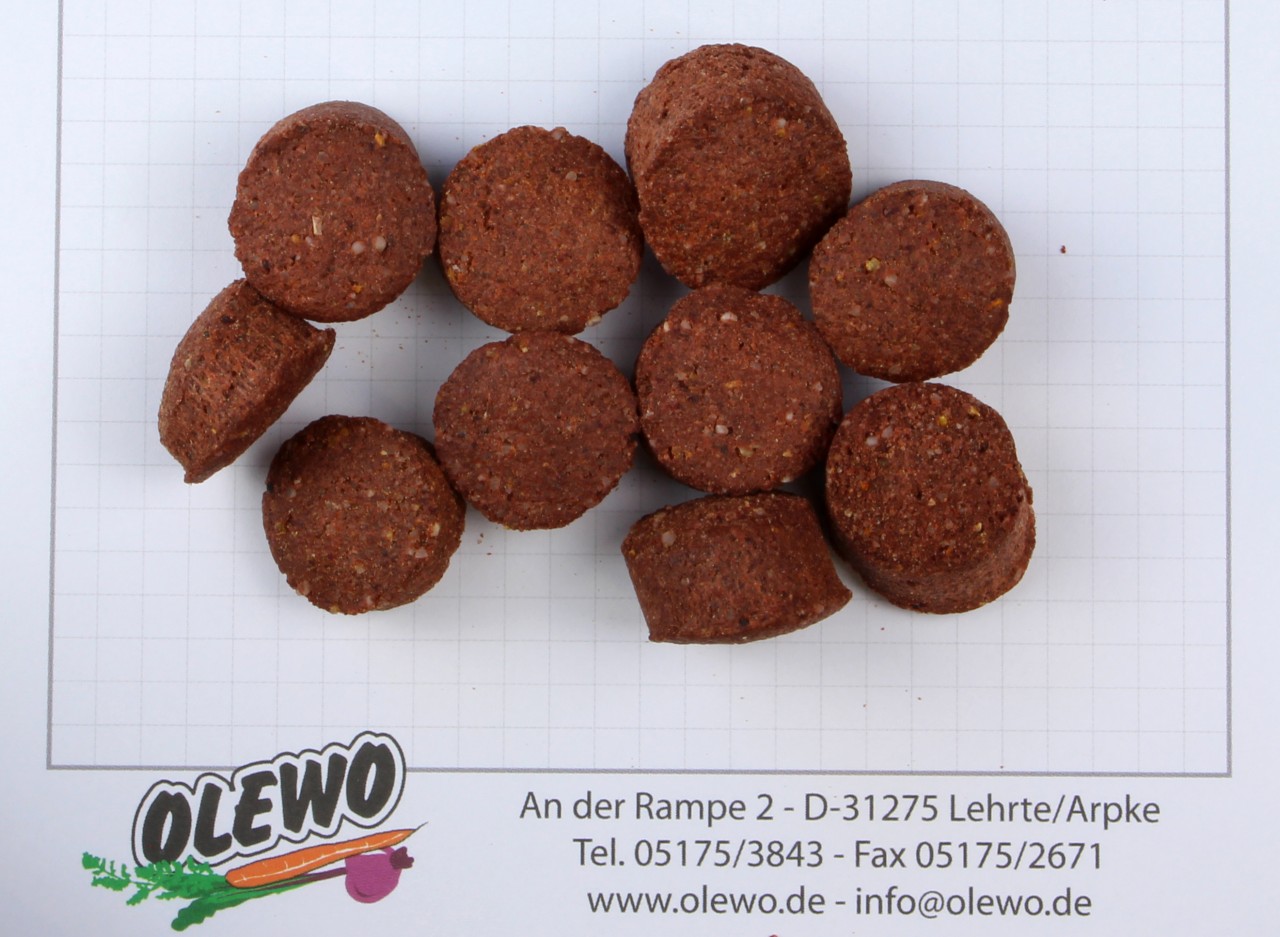 OLEWO-Rüblies erhältlich in 100g / 200 g / 1,0 kg / 4,0 kg / 12,5 kg und 25 kg OLEWO-Rüblies der leichte Snack für Zwischendurch ab 25,00 € Warenwert können Sie die 100 g OLEWO-Rüblies zum Testen als Prämie mitbestellen Ergänzungsfuttermittel für Hunde und Pferde - Fütterungsempfehlung: Hund: je nach Größe Ihres Hundes 1 - 10 OLEWO-Rüblies / Tag Pferd: je nach Größe bis zu 500 g OLEWO-Rüblies / Tag Bitte einzeln und unter Aufsicht verfüttern Zusammensetzung: Reis - 11,5 % Karotte, getrocknet - 11,5 % Rote Bete, getrocknet - Rapsöl Inhaltsstoffe: Rohprotein: 6,5 % - Rohfett: 6,9 % - Rohfaser: 1,5 % - Rohasche: 2,5 % - Calcium: 0,22 % - Phosphor: 0,15 % - Natrium: 0,10 % OLEWO GmbH - An der Rampe 2 - D-31275 Lehrte/Arpke- 05175/3843 - order@olewo.de - www.olewo.de Reg.-Nr. gem. Verordnung (EG) 183/2005 (Futtermittelhygieneverordnung): 41.3-63316-49496