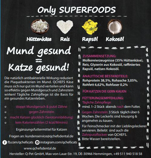 Mund gesund = Katze gesund! Die natürlich antibakterielle Wirkung reduziert die Plaquebakterien im Maul. QCHEFS Käse muss sich nur gut im Mund verteilen und kann so effektiv gegen Mundgeruch und Zahnstein wirken! Tägliche Zahnpflege ist die Basis für ein gesundes Katzenleben.