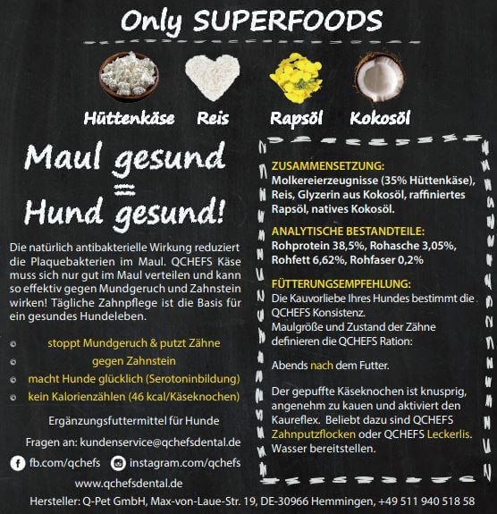 Mund gesund = Hund gesund! Die natürlich antibakterielle Wirkung reduziert die Plaquebakterien im Maul. QCHEFS Käse muss sich nur gut im Mund verteilen und kann so effektiv gegen Mundgeruch und Zahnstein wirken! Tägliche Zahnpflege ist die Basis für ein gesundes Hundeleben.