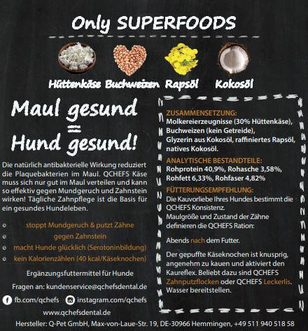Mund gesund = Hund gesund! Die natürlich antibakterielle Wirkung reduziert die Plaquebakterien im Mund. QCHEFS Käse muss sich nur gut im Maul verteilen und kann so effektiv gegen Mundgeruch und Zahnstein wirken! Tägliche Zahnpflege ist die Basis für ein gesundes Hundeleben.