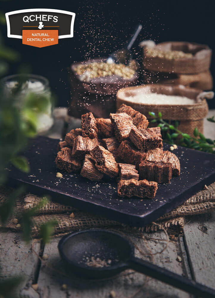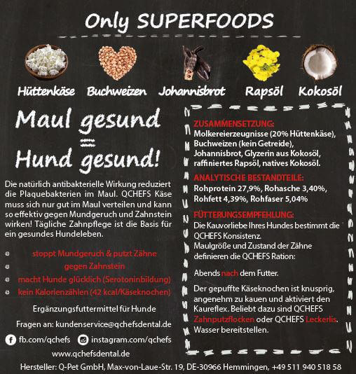 Mund gesund = Hund gesund! Die natürlich antibakterielle Wirkung reduziert die Plaquebakterien im Maul. QCHEFS Käse muss sich nur gut im Mund verteilen und kann so effektiv gegen Mundgeruch und Zahnstein wirken! Tägliche Zahnpflege ist die Basis für ein gesundes Hundeleben.
