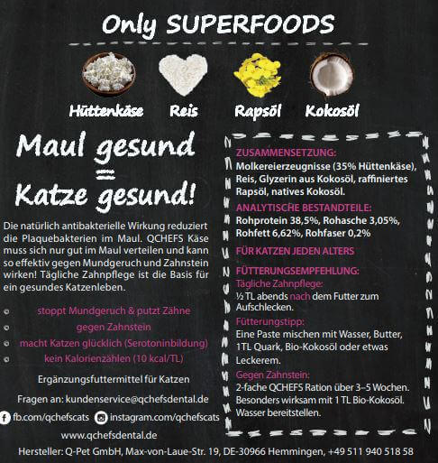 Mund gesund = Katze gesund! Die natürlich antibakterielle Wirkung reduziert die Plaquebakterien im Maul. QCHEFS Käse muss sich nur gut im Mund verteilen und kann so effektiv gegen Mundgeruch und Zahnstein wirken! Tägliche Zahnpflege ist die Basis für ein gesundes Katzenleben.
