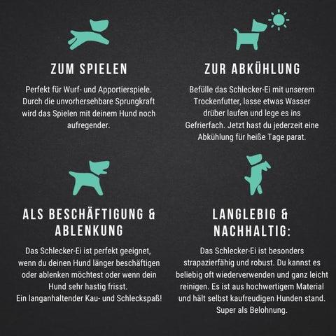 - Als Anti-Schling-Tool: Dein Hund frisst aus dem Schlecker-Ei deutlich langsamer. In den Napf zum Futter gelegt, muss dein Hund das Schlecker-Ei beim Fressen hin und herschieben und schlingt nicht mehr so hastig.